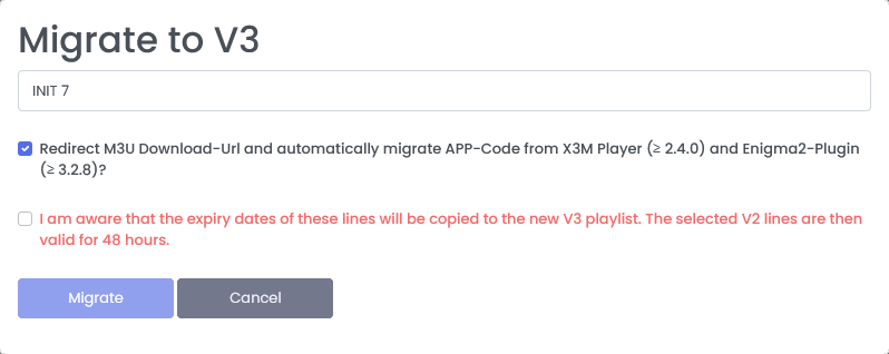 If you have enabled the option “Redirect M3U Download-Url and automatically migrate APP-Code from X3M Player (≥ 2.4.0) and Enigma2-Plugin (≥ 3.2.8)“, then the old V2 Download-URL will be automatically redirected to the new one. This gives you enough time to enter the new Download-URL in your App. APP-Code from X3M-Player from version 2.4.0 and Enigma2 plugin from version 3.2.8 will be migrated automatically. The migration of the app code is performed when the playlist is first loaded. The app generates a new code and only then becomes visible in the new playlist.