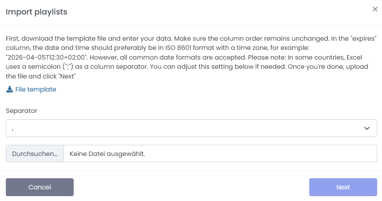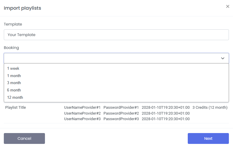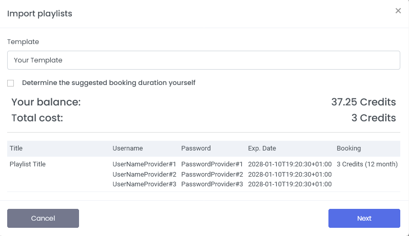 Now you’ll see the contents of your file again for review. Select the template to be used for these playlists. The booking will be determined based on the expiration date of the first provider. Our system calculates the closest suitable one. You can also determine this yourself for all entries. Click “Determine the suggested booking duration yourself.” If you choose to do so, you can specify the duration for which these playlists should be valid in our system. The costs will be automatically deducted from your account after import.