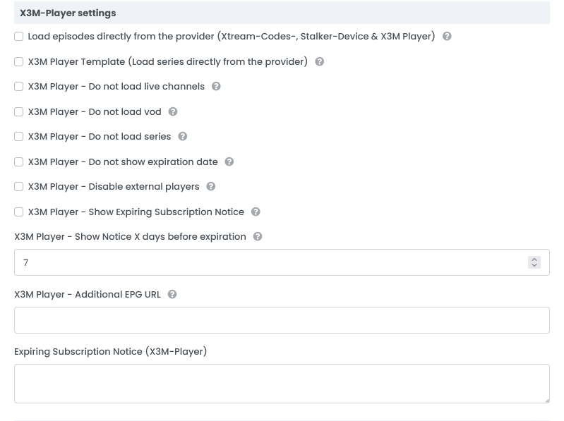This setting blocks the use of external players (VLC, MX Player) in the X3M Player app - X3M Player (only) – Show Expiring Subscription Notice