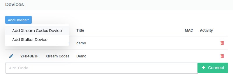 If you want to connect a Stalker device (Infomir MAG, Formuler or similar) to your playlist, click on “Add device” in this area and then on “Add Stalker device”