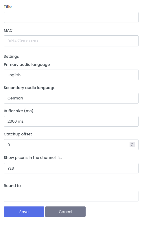 “Bound to” field is an option on Xtream-Codes devices to bind the playlist to an IP address. This is optional but we recommend this as a security setting. After you have activated this option, the IP address of the client will be saved the next time the playlist is loaded via the XC API. After that, only requests from this IP address will be accepted.