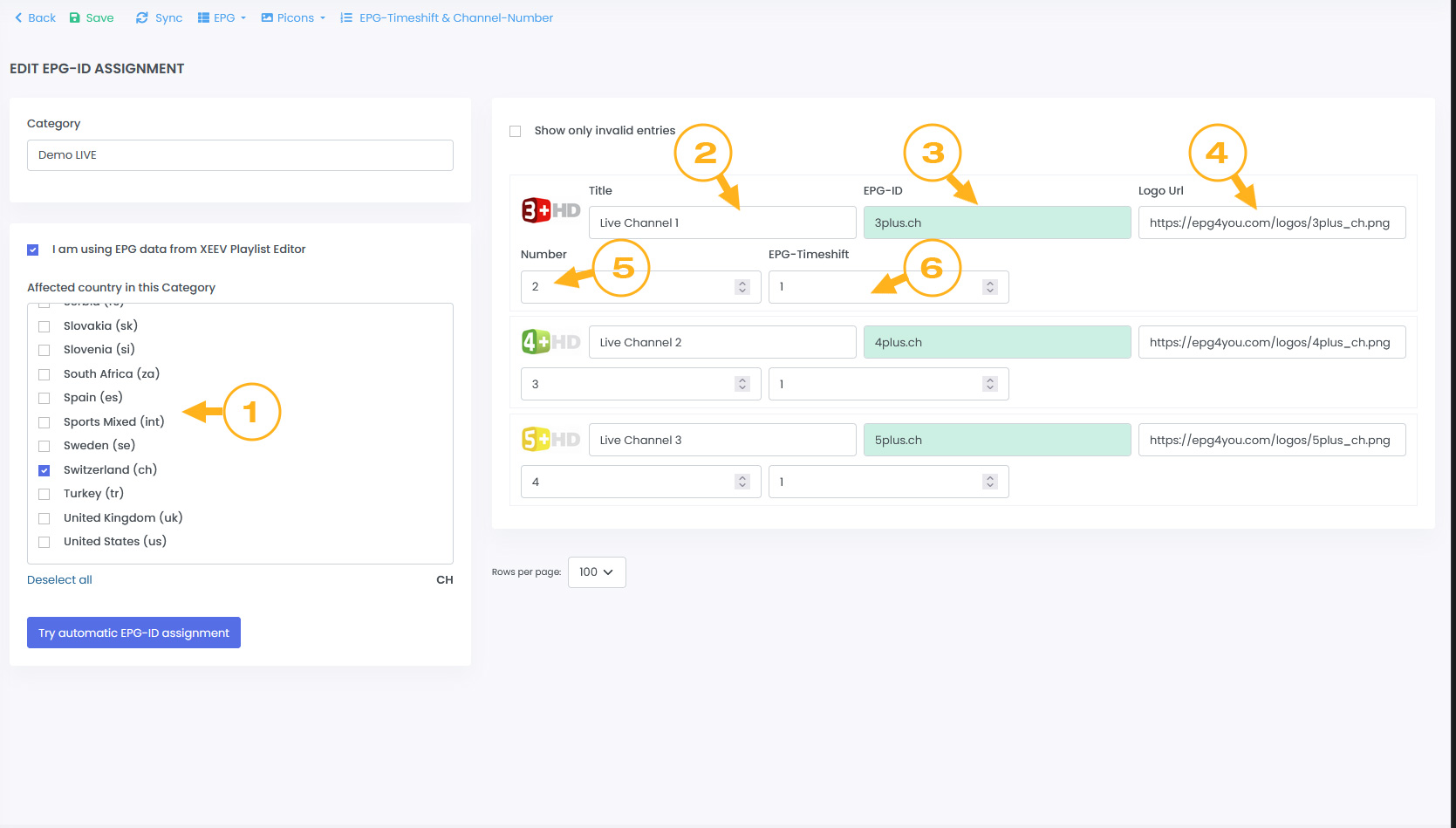 In this stream list you can also change the stream names, Logo-Url (4), Number (5) and EPG-Timeshift (6).