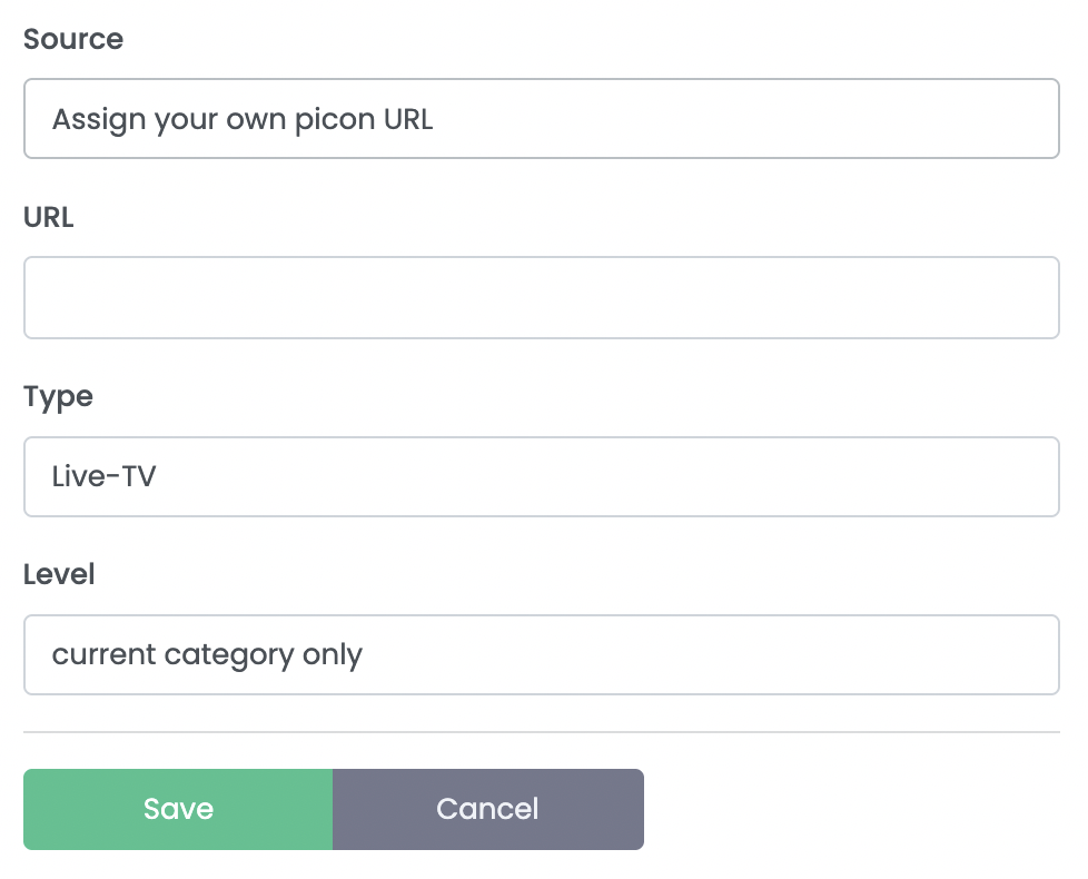 Depending on the type of category (LIVE, MOVIE, SERIES) you will get an EPG-ID or TMDB assignment dropdown